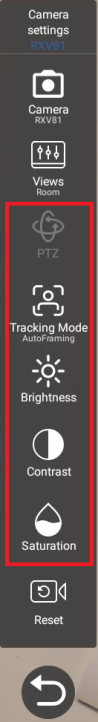 Change camera settings as required using the options on the vertical toolbar. Pan, Tilt, and Zoom (PTZ) can only be modified if 'Tracking Mode' is Manual. |