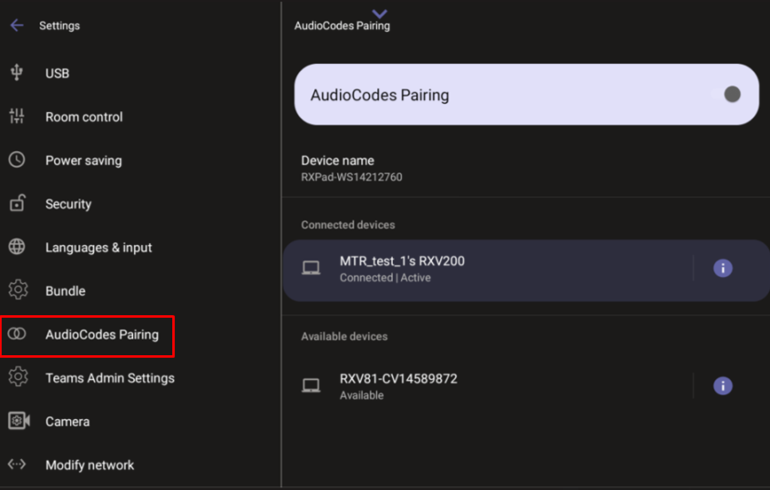 4. After unpairing, return to AudioCodes Pairing and tap the MTRA you wish to pair with the RX-PAD.