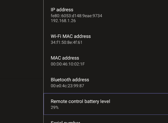 You can also view the RCU battery level anytime on the 'Status' page. To access this page, navigate to the 'About' page (see View RXV81 Information), then tap Status.