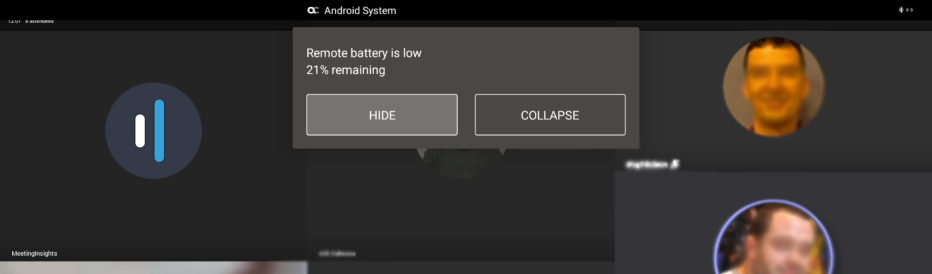 If the RCU batteries run low, the RXV81 application notifies you about the issue. This notification is sent to the screen / TV, as well as to AudioCodes’ Device Manager. It indicates that the battery voltage level is low and what percentage level is left. Tap HIDE to conceal the notification.