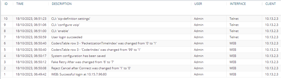 If you have enabled the reporting of management user activities performed in the device's management interfaces (see Configuring Reporting of Management User Activities), you can view the logged activities in the Web interface, as described in the procedure below.