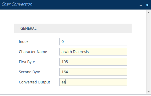 The Char Conversion table lets you configure up to 40 Character Conversion rules. A Character Conversion rule maps (converts) accented characters (Unicode / UTF-8) received from the IP side into simple ASCII characters (ISO-8859) for sending to the Tel side. Typically, the device receives the caller ID and calling name in Unicode characters (in the SIP INVITE message). Unicode characters consist of two bytes, while ASCII characters consist of one byte. Accented characters are used in various languages such as German. An example of such a character is the umlaut (or diaeresis), which consists of two dots placed over a letter, as in ä. The importance of this conversion feature is that it allows Tel entities that do not support accented characters, to receive ASCII characters. For example, the device can convert the Unicode character ä into the ASCII character "ae".