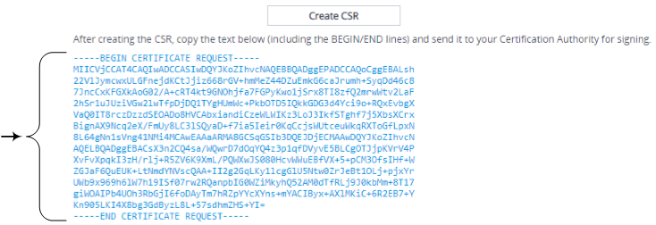 Click the Create CSR button; a textual certificate signing request is displayed below the button: |