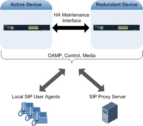 The figure below illustrates the Active-Redundant HA devices under normal operation. Communication between the two devices is through a Maintenance interface, having a unique IP address for each device. The devices have identical software and configuration including network interfaces (i.e., OAMP, Control, and Media), and have identical local-port cabling of these interfaces.