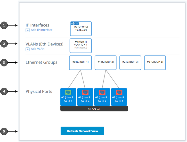 The Network view lets you easily build and view your voice network topology entities, including IP network interfaces, Ethernet Devices (VLANs), Ethernet Groups, and physical Ethernet ports. The Network view graphically displays these entities and the associations between them, giving you a better understanding of your network topology and configuration. You can use the Network view as an alternative to configuring the entities in their respective Web pages or you can use it in combination.