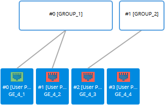 Displays configured Ethernet Groups (see Configuring Ethernet Port Groups). The Ethernet Groups appear as icons, displaying the row index number, and name. Ethernet ports associated with Ethernet Groups are indicated by lines connecting between them, as shown in the example below: