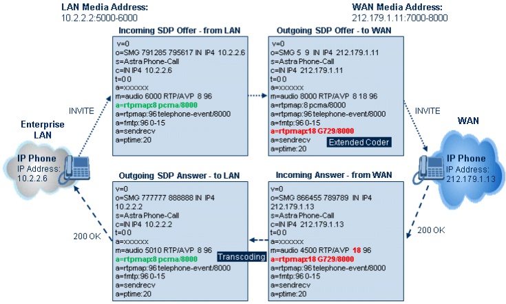 The figure below illustrates transcoding between two SIP entities (IP Groups) where one uses G.711 (LAN IP phone) and the other G.729 (WAN IP phone). The initial SDP offer received on the inbound leg from the LAN IP phone includes coder G.711 as the supported coder. In the outgoing SDP offer on the outbound leg to the WAN IP phone, the device adds extension coder G.729 to the SDP, which is supported by the WAN IP phone. The subsequent incoming SDP answer from the WAN IP phone includes the G.729 coder as the chosen coder. Since this coder was not included in the original incoming SDP offer from the LAN IP phone, the device performs G.729-G.711 transcoding between the inbound and outbound legs.