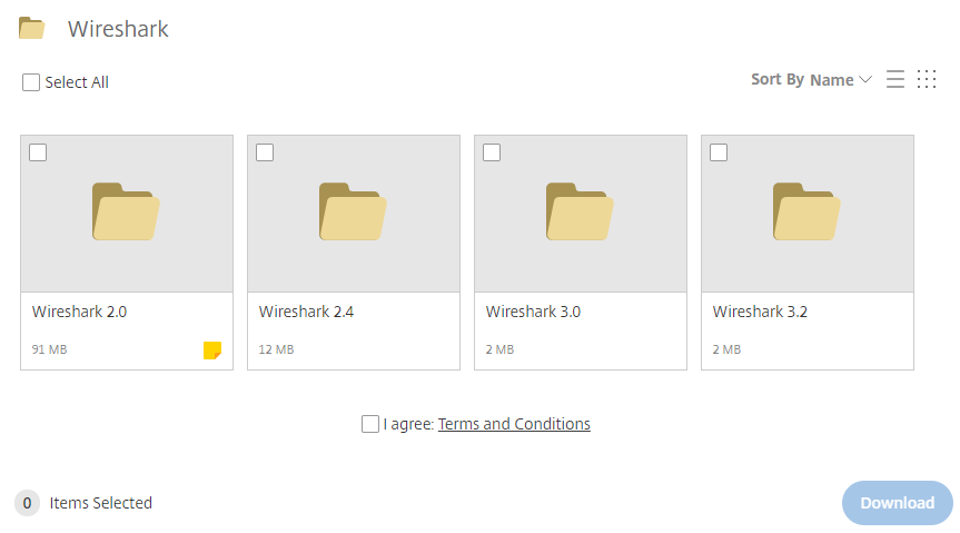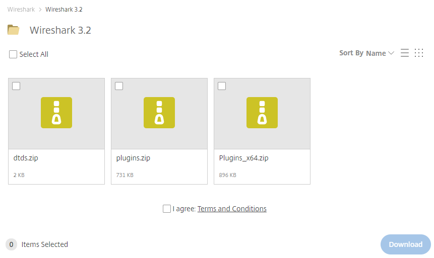c. Click the folder icon of the required Wireshark version; zipped folders of the selected Wireshark version are displayed: