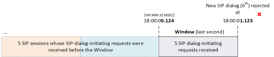 | ◆ | Scenario #2: Out of the 10 SIP sessions, SIP dialog-initiating requests of 5 of the sessions were received in the last second (18:00:00.124-18:00:01.123). Therefore, the device rejects the new incoming SIP dialog because the configured rate limit (5) has been exceeded. |