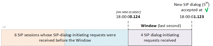 | ◆ | You have configured the rate to 5 (using the 'Rate' parameter). In other words, a maximum of 5 SIP dialog-initiating requests are allowed in the last second (window). |