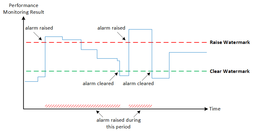 As shown in the illustration, the alarm is only raised once it crosses the raise watermark threshold in the up direction (i.e., performance monitoring parameter value is greater than the threshold). The raised alarm is only cleared when it crosses the clear watermark threshold.