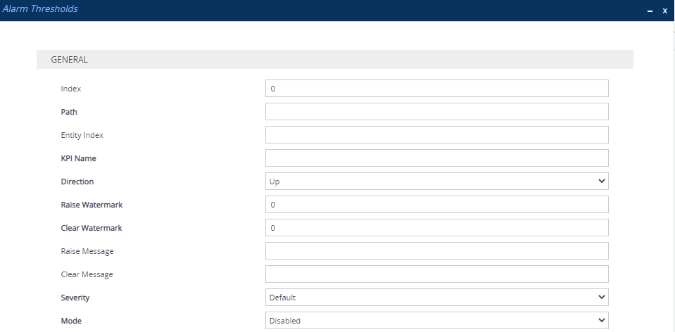 For example, assume that you configure the parameter to Down, the 'Raise Watermark' parameter to 50 and the 'Clear Watermark' parameter to 60. When the performance monitoring parameter's value becomes less than 50 (e.g., 45), an alarm is raised. When the performance monitoring parameter's value becomes greater than 60 (e.g., 62), the alarm is cleared. Note: The parameter is mandatory. |