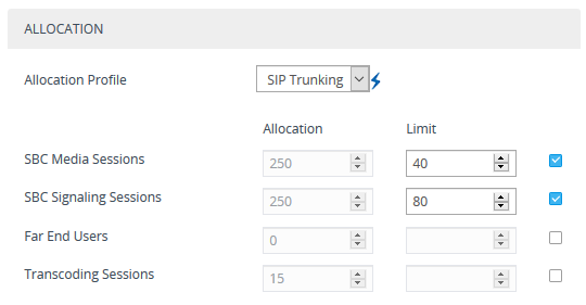 The figure below shows an example of using the 'Limit' field to reduce the allocation of SBC Media Sessions to 40 and the SBC Signaling Sessions to 80 for the SIP Trunking Allocation Profile: