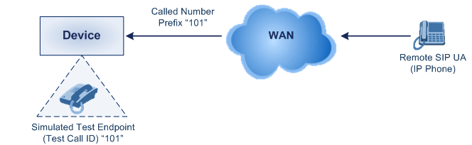 For example, if you configure the prefix number (Test Call ID) of the test endpoint (see procedure below) to "101" and the incoming INVITE Request-URI user part is 101, 10123, or 10145, the device considers this call as a basic test call because the prefix of the user part matches the test endpoint's Test Call ID ("101"). The figure below displays a basic test call example: