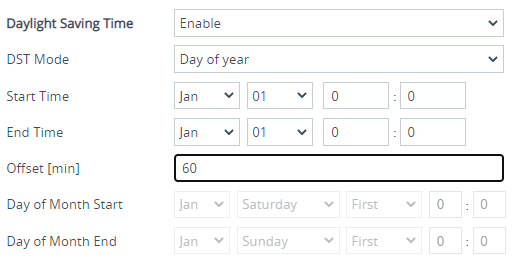 Day of year: The range is configured by exact date (day number of month), for example, from March 30 to October 30. If 'DST Mode' is set to Day of year, in the 'Start Time' (DayLightSavingTimeStart) and 'End Time' (DayLightSavingTimeEnd) drop-down lists, configure the period for which DST is relevant.