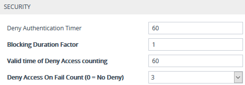 'Deny Access On Fail Count' [DenyAccessOnFailCount]: Define the maximum number of failed login attempts, after which the requesting IP address (management station) for all users is blocked. |