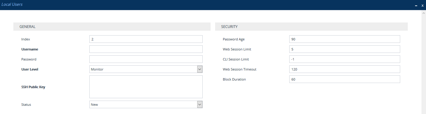 | ● | Only Security Administrator users can configure users in the Local Users table. |