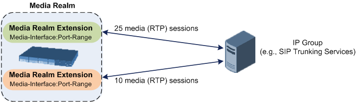 Media Realm Extensions can be useful, for example, to overcome limitations of the maximum number of media ports supported per interface. Instead of configuring only a single Media Realm in the Media Realms table (see Configuring Media Realms), you can also configure additional "Media Realms" in the Media Realm Extensions table associated with the single Media Realm. An IP Group that is associated with a Media Realm configured with Media Realm Extensions, allocates its media sessions / ports between the different interfaces, as configured by the Media Real and its associated Media Realm Extensions. For example, two Media Realm Extensions could be configured, whereby one allocates 25 media sessions on interface "LAN-1" and another, 10 sessions on interface "LAN-2". The Media Realm associated with these Media Realm Extensions would be assigned to the relevant IP Group.
