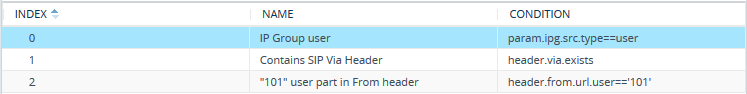 | ■ | Index 0: Incoming SIP dialog that is classified as belonging to a User-type IP Group. |
