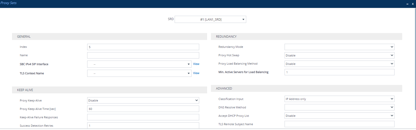 If you are configuring the Proxy Sets with IP addresses, it is highly recommended to configure each Proxy Set with a unique IP address. Configuring multiple Proxy Sets with the same IP address can cause problems classifying incoming SIP requests to source IP Groups based on Proxy Set. If you have configured multiple Proxy Sets with the same IP address, the device uses the Proxy Set with lowest Index number. For example, if you have configured Proxy Set ID #1 and Proxy Set ID #4 with the same IP address, the device uses Proxy Set ID #1 to classify the incoming SIP request to an IP Group.