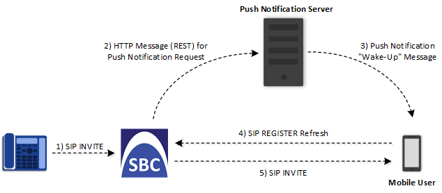 The device supports the Push Notification Service per IETF draft "Push Notification with the Session Initiation Protocol (SIP)". This service is used to wake end-user equipment (typically, mobile platforms) and operating systems that have gone to "sleep" (to save resources such as battery life) so that they can receive traffic. Typically, each operating system uses a dedicated Push Notification Service. For example, Apple iOS devices use the Apple Push Notification service (APNs) while Android devices use the Firebase Cloud Messaging (FCM) service. Without using a Push Notification Service to wake SIP User Agents (UAs), UAs wouldn't be able to send binding-refresh SIP REGISTER requests, receive SIP requests (e.g., INVITE), or send periodic keep-alive messages for maintaining connectivity with SIP servers. The device communicates with third-party, HTTP-based Push Notification Servers over HTTP, using RESTful APIs for exchanging information (currently, only JSON format is supported).