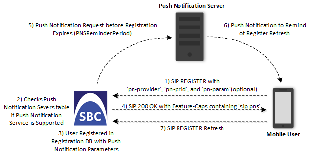 Configure the time (in seconds) before the user's registration on the device expires, when the device sends a push notification request (over HTTP) to the Push Notification Server to trigger it into sending a push notification to the user to remind it to send a refresh REGISTER message to the device. This is configured by the [PNSReminderPeriod] parameter or CLI command configure voip > sbc settings > pns-reminder-period).