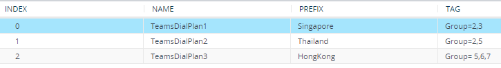 1. Open the Dial Plan table (see Configuring Dial Plans), and then configure a Dial Plan containing Dial Plan rules of Teams sites and the groups they belong to. For example, a Dial Plan called "RegionsDP" is configured with rules that include the Teams sites Singapore, Thailand and Hong Kong and the groups that each belong to: