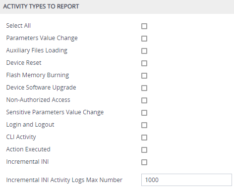 Modifications of parameters due to an incremental ini file upload. If you choose this option, you can also define the maximum number of lines of parameters to log from the ini file, using the 'Incremental INI Activity Logs Max Number' parameter.