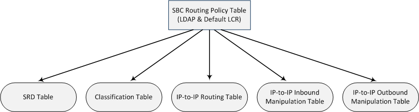 For all other deployment scenarios, the Routing Policy is irrelevant and the handling of the configuration entity is not required as a default Routing Policy ("Default_SBCRoutingPolicy" at Index 0) is provided. When only one Routing Policy is required, the device automatically associates the default Routing Policy with newly added configuration entities that can be associated with the Routing Policy (as mentioned later in this section, except for Classification rules). This facilitates configuration, eliminating the need to handle the Routing Policy configuration entity (except if you need to enable LCR and/or assign an LDAP server to the Routing Policy). In such a setup, where only one Routing Policy is used, single routing and manipulation tables are employed for all SRDs.