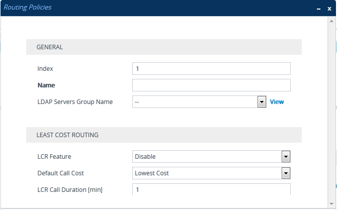 Enables Least Cost Routing (LCR), and configures default call cost (highest or lowest) and average call duration for routing rules that are not assigned LCR Cost Groups. The default call cost determines whether matched routing rules that are not assigned Cost Groups are considered as a higher or lower cost route compared to other matching routing rules that are assigned Cost Groups. If you disable LCR, the device ignores the Cost Groups assigned to the routing rules in the IP-to-IP Routing table.