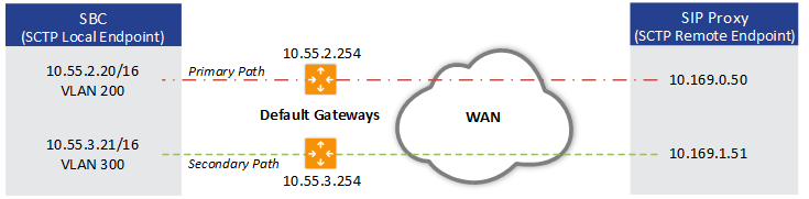 In SCTP with multi-homing, the device acts as the local SCTP endpoint while the SIP proxy (Proxy Set) acts as the remote SCTP endpoint. These endpoints can provide one or a list of IP addresses (and SCTP port) through which they can be reached (connection path) and from which it will originate SCTP messages. The primary path is the destination and source address that will be put into an SCTP packet outbound to the peer endpoint, by default. The device supports up to two local IP addresses (IP Interfaces) per SIP Interface (i.e., local SCTP endpoint), where one is configured as the primary address and the other as the secondary address. For the remote SCTP endpoint (i.e., proxy), the device supports multiple IP addresses. A single SCTP port number is used for all the addresses at the endpoint. Each SIP Interface creates its own SCTP association (identified by an Association ID) with the proxy, which can include multiple paths.
