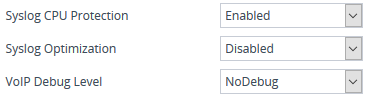 From the 'Syslog CPU Protection' [SyslogCpuProtection] drop-down list, select whether you want to enable the protection feature for the device's CPU resources during debug reporting, ensuring voice traffic is unaffected. If CPU resources drop (i.e., high CPU usage) to a critical level (user-defined threshold), the device automatically lowers the debug level to free up CPU resources that were required for the previous debug-level functionality. When CPU resources become available again, the device increases the debug level to its' previous setting. For example, if you set the 'Debug Level' to Detailed and CPU resources decrease to the defined threshold, the device automatically changes the level to Basic, and if that is not enough, it changes the level to No Debug. Once CPU resources are returned to normal, the device automatically changes the debug level back to its' original setting (i.e., Detailed). The threshold is configured by the [DebugLevelHighThreshold] parameter. |