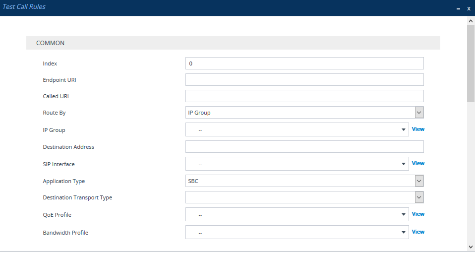 You can also use this parameter if you configure the 'Route By' parameter to Dest Address. This allows you to associate an IP Profile (that is assigned to the specified IP Group) with the Test Call. The Test Call is not routed to the IP Group, but uses only its IP Profile.