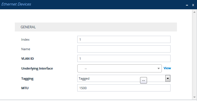 The Ethernet Devices table lets you configure up to 1,024 Ethernet Devices. An Ethernet Device represents a Layer-2 bridging device and is assigned a VLAN ID and an Ethernet Group (Ethernet port group). Multiple Ethernet Devices can be associated with the same Ethernet Group. The Ethernet Device (VLAN) can be configured with a VLAN tagging policy, which determines whether the Ethernet Device accepts tagged or untagged packets received on the Ethernet port associated with the Ethernet Device.