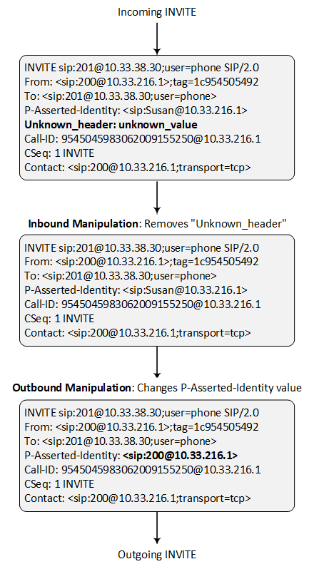 The following figure illustrates an example of a SIP message that's manipulated by the device as follows: