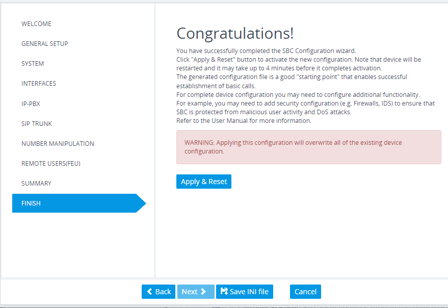 Click Apply & Reset to apply configuration to the device or click Save INI File to save configuration as an ini file on your PC.