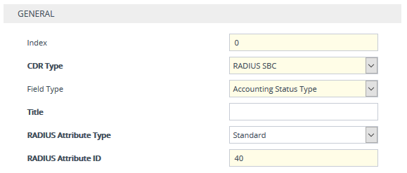CDRs for RADIUS accounting and sent in RADIUS accounting request messages. For RADIUS accounting CDRs, you can customize the RADIUS Attribute's prefix name and RADIUS Attribute's ID, for standard RADIUS Attributes and vendor-specific RADIUS Attributes (VSA). For example, instead of the default VSA name "h323-connect-time" with RADIUS Attribute ID 28, you can change the name to "Call-Connect-Time" with ID 29. You can configure up to 128 RADIUS-Accounting CDR customization rules (i.e., maximum number of RADIUS Attributes that the device can include in the CDR). For more information on RADIUS accounting, see Configuring RADIUS Accounting. |