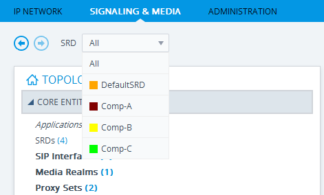The filter is applied throughout the Web GUI. When you select an SRD for filtering, the Web interface displays only table rows associated with the filtered SRD. When you add a new row to a table, the filtered SRD is automatically selected as the associated SRD. For example, if you filter the Web display by SRD "Comp-A" and you then add a new Proxy Set, the Proxy Set is automatically associated with this SRD (i.e., the 'SRD' parameter is set to "Comp-A"). All other parameters in the dialog box are also automatically set to values associated with the filtered SRD.