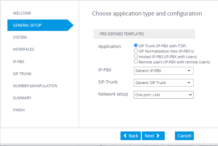 The General Setup wizard page defines the network topology of the device, which includes the application (e.g., SIP trunk) and the involved third-party vendors, configuration template based on the selected vendor interoperability, and physical network (ports).
