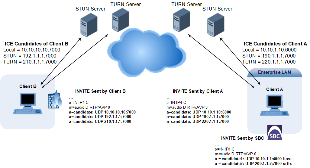 | ■ | ICE-Lite: When configured for ICE-Lite, the device doesn't initiate the ICE process. Instead, it supports remote endpoints that initiate ICE to discover their workable public IP address with the device. Therefore, the device supports the receipt of STUN binding requests for connectivity checks of ICE candidates and responds with STUN responses. Note that in the response to the INVITE message received from the remote endpoint, the device sends only a single candidate for its' IP address. This is the IP address of the device that the client uses. |