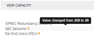Indicates the capacity change of an existing feature. Move your mouse over the icon to view a pop-up describing the capacity change, as shown in the following example for the SBC Sessions license: