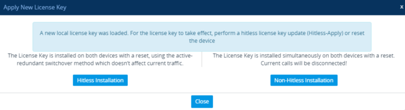 Hitless Installation: This method allows you to install the License Key on both active and redundant devices without affecting traffic. The installation process is as follows: |
