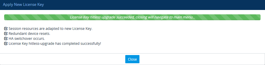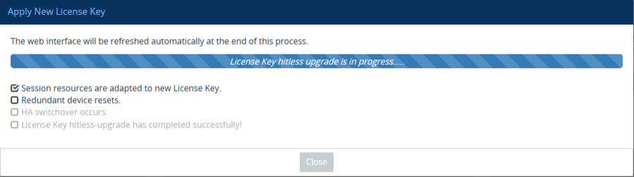 Hitless Installation: Installs the License Key without affecting traffic by employing the HA switchover mechanism. When you click the button, the process starts and a message box is displayed indicating the installation progress: |