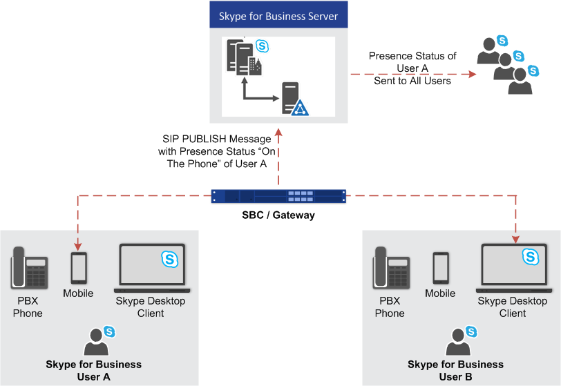 Microsoft presence capability allows Skype for Business users to know the status (e.g., "Available" or "Do Not Disturb") of their contacts. Presence status of contacts is displayed on the user's Skype for Business endpoint. Presence information of Skype for Business endpoints (such as Skype for Business desktop client) is handled solely by the Skype for Business Server, without any intervention of the device. However, when third-party (non-Skype for Business) endpoint devices (e.g., mobile phone or PBX phone) are used by the Skype for Business users, presence status information can only be reported to the Skype for Business Server by the device. For example, if John and Alice are Skype for Business users and John makes or receives a call on a mobile device, Alice is able to see that John is in a call, even though the call is not on a native Skype for Business endpoint. Once the device reports the presence status, the Skype for Business Server sends this status change to the Skype for Business users in the network.