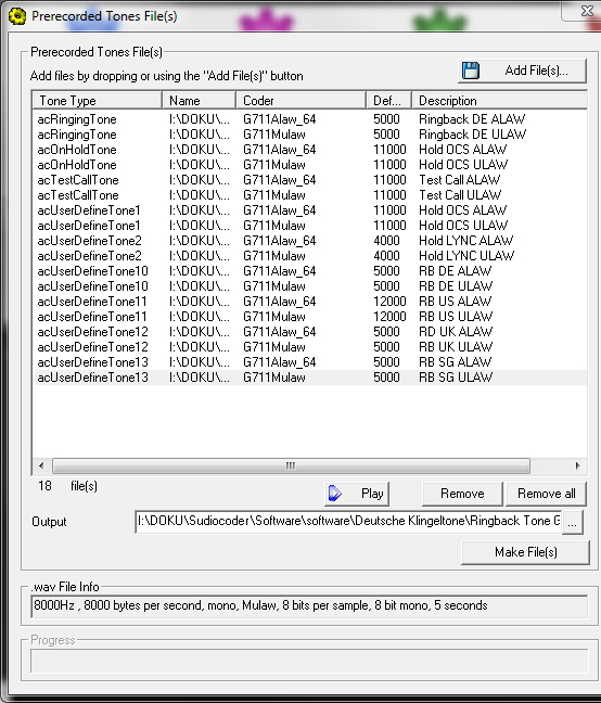 Once recorded, you need to combine the recorded files into a single and loadable PRT file (.dat), using the latest version of AudioCodes DConvert utility. In DConvert, each recording must be added to the PRT file with the tone type "acUserDefineTone<Index>". When you want to specify the tone (ringback or held tone) to play for a specific IP Profile ('Local Ringback Tone Index' and 'Local Held Tone Index' parameters), you need to use this index number. For more information on the DConvert utility, refer to the DConvert Utility User's Guide. Once you have created the PRT .dat file, you need to upload it to the device (flash memory).