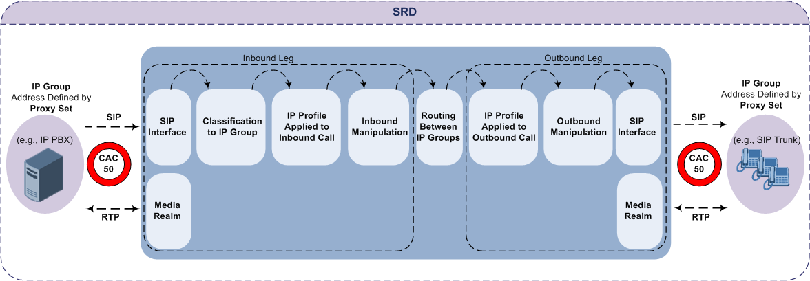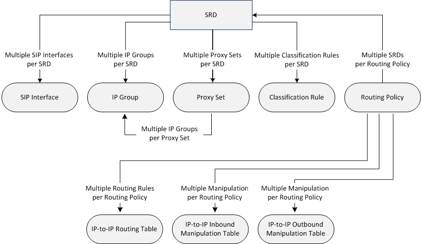 An SRD is a logical representation of your entire SIP-based VoIP network (Layer 5) containing groups of SIP users and servers. The SRD is in effect, the foundation of your configuration to which all other previously mentioned configuration entities are associated. For example, if your VoIP network consists of three SIP entities -- a SIP Trunk, a LAN IP PBX, and remote WAN users -- the three SIP Interfaces defining these Layer-3 networks would all assigned to the same SRD.