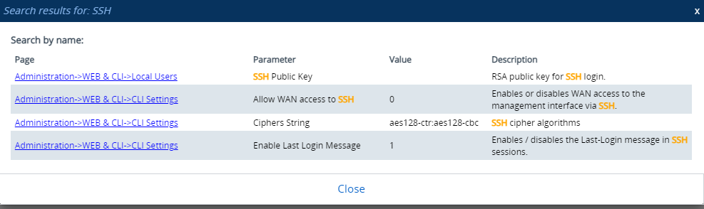 You can search in the Web interface for parameter names (standalone or table parameters) and values. The search string can be the entire parameter name (Web or ini file) or part of the parameter name. If you search for partial string, all parameters containing the string in their names or in in their descriptions are listed in the search result.