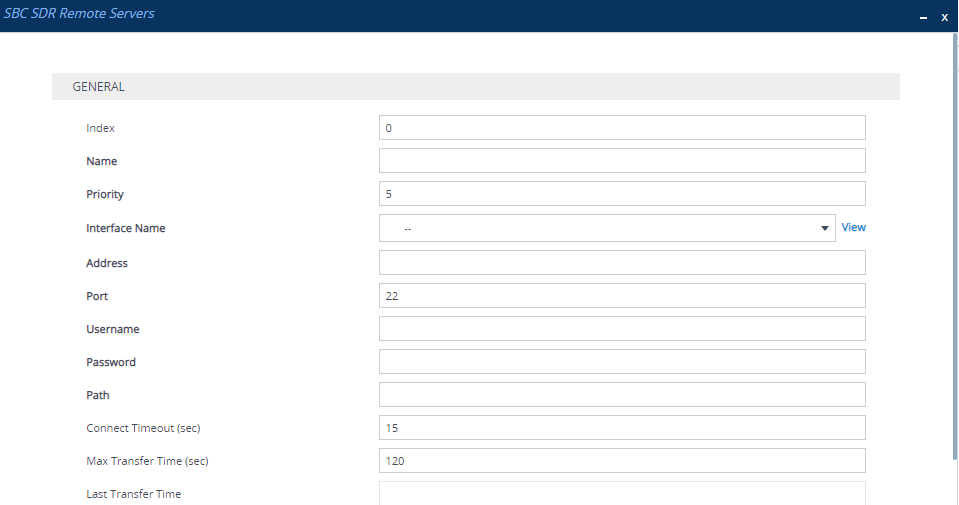 If you have enabled SDR local storage (as described in Storing SDRs Locally on the Device), you can also configure the device to automatically transfer the locally stored SDR files to up to two third-party, remote servers. The second server is used only as a backup if the device fails to send the file to the primary server (for whatever reason). Once the device creates an SDR file for local storage (i.e., according to the 'Rotation Period' and 'File Size' parameters), it then also sends the file to the configured remote server.