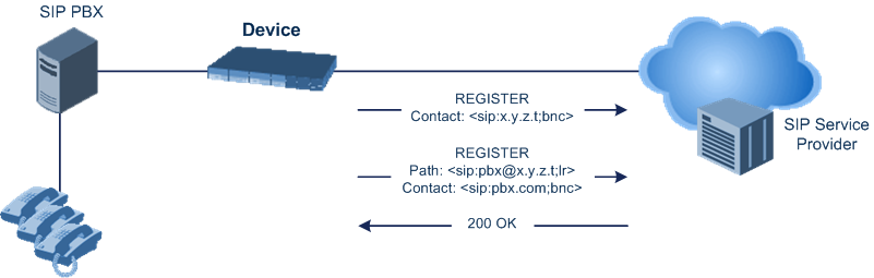The SIP REGISTER request sent by the device for GIN registration with a SIP server provider contains the Require and Proxy-Require headers. These headers contain the token 'gin'. The Supported header contains the token 'path' and the URI in the Contact header contains the parameter 'bnc' without a user part: