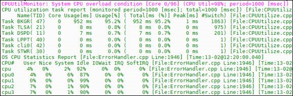 Whenever the device detects a CPU overload, it sends a syslog message that shows CPU utilization of the different processes (tasks) per core. This information can help in identifying the cause of the overload. When the devicedetects a CPU overload, it sends a syslog message every 10 seconds until it returns to normal state.